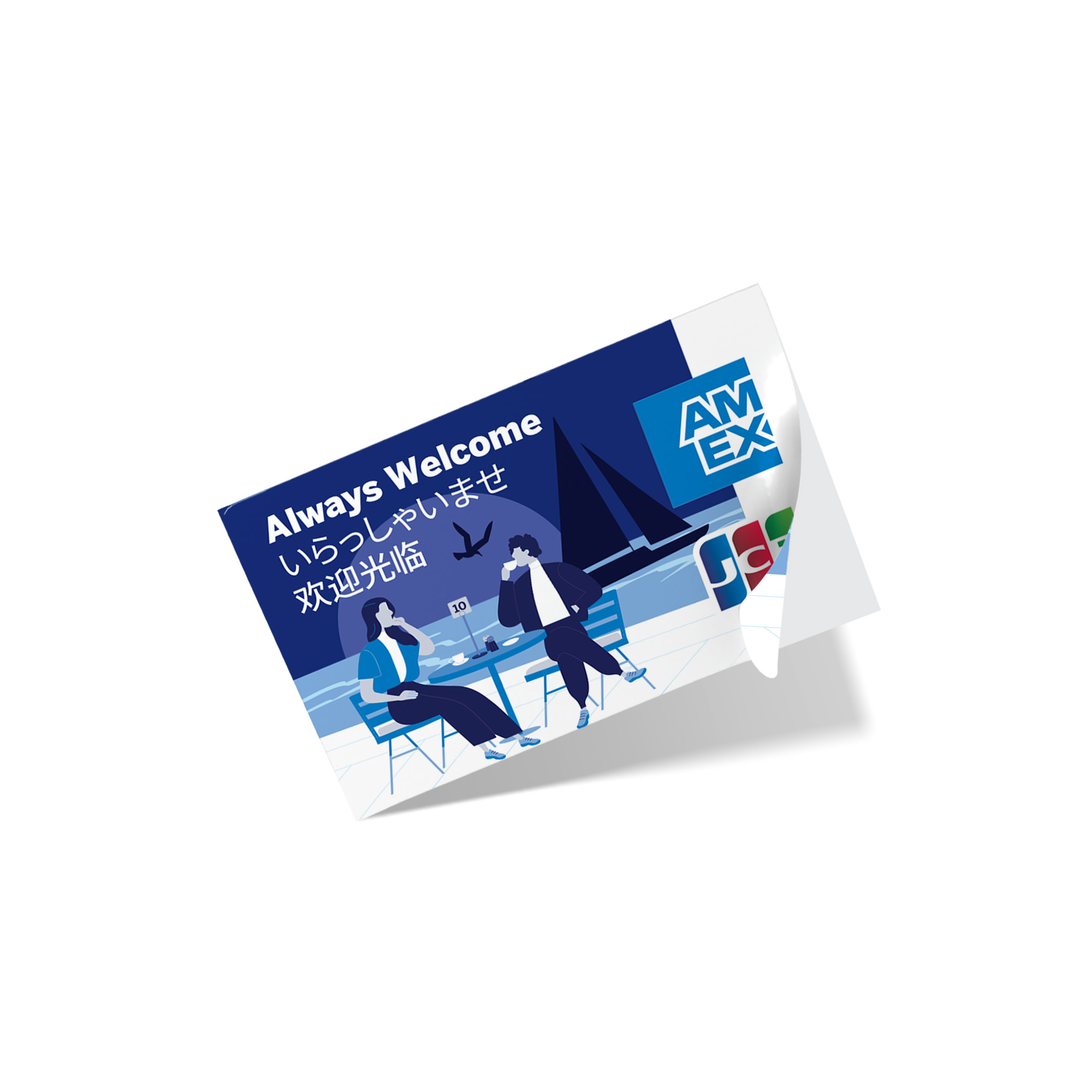 Welcome international tourists into your retail store or dining place. The "Always Welcome" message is in English, Japanese and Chinese. Place these stickers to highlight to international visitors that they are welcome to use their Amex or JCB Cards to shop in your business.