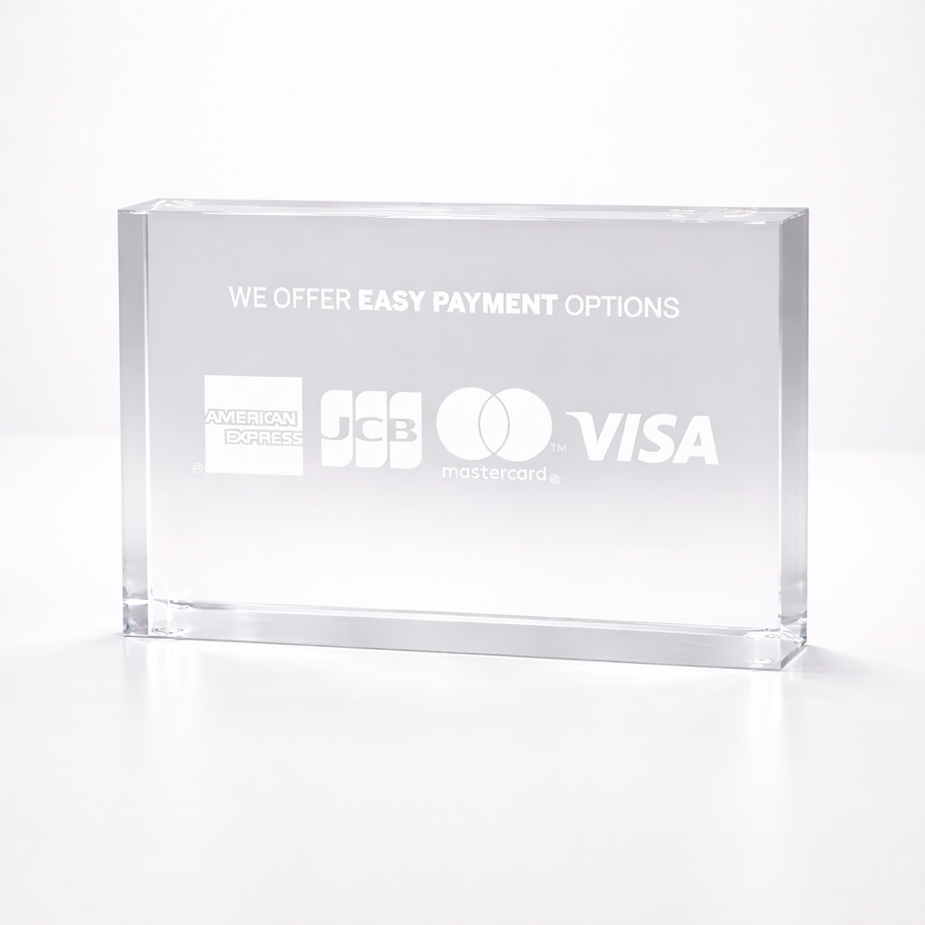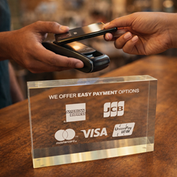 This subtle block signals to your customers which cards you accept, so they can pay in the way that's most convenient for them. Place it on the counter where your customers will see it, whilst complimenting a clean store look.