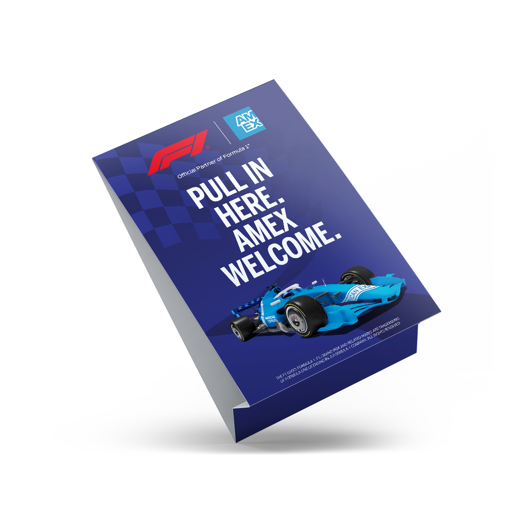 The tent card lets you show you welcome Formula 1 fans and can be displayed on bench and point of sale to encourage American Express transactions.